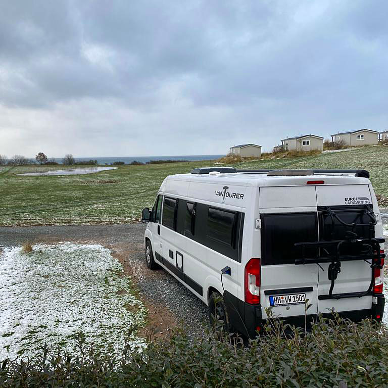 Das Highlight des Platzes, das wir schon von einem Aufenthalt in einem Mietwohnwagen von vor ein paar Jahren her kannten: die Sauna! Mit 24,- € für zwei Personen für vier Stunden ist der Preis für eine quasi Privatsauna mit Meerblick (sofern man die Ostsee vor lauter Schneetreiben sehen kann) angemessen.