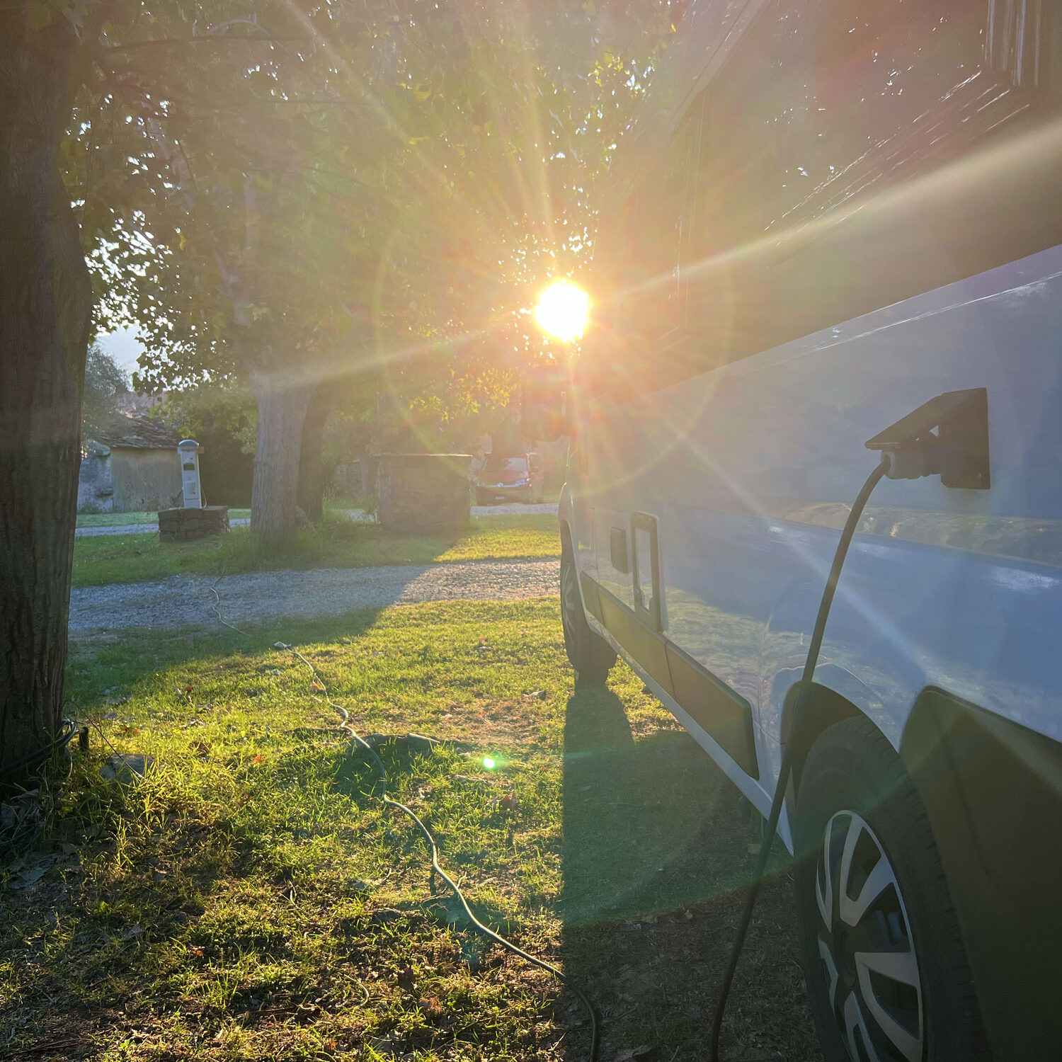 Zugegeben: der Stromanschluss musste über die Zuwegung des Platzes erfolgen, aber ist im Grunde genommen auch kein Problem. Ausreichend Meter auf der Kabeltrommel und gut ist. Der Platz bietet viel Entfaltungsfreiraum, da die einzelnen Parzellen nicht abgesteckt sind. Einfach einen geeigneten Stellplatz suchen, Keile positionieren (ist schon ein wenig abschüssig) und die Freiheit unter den alten Bäumen genießen.